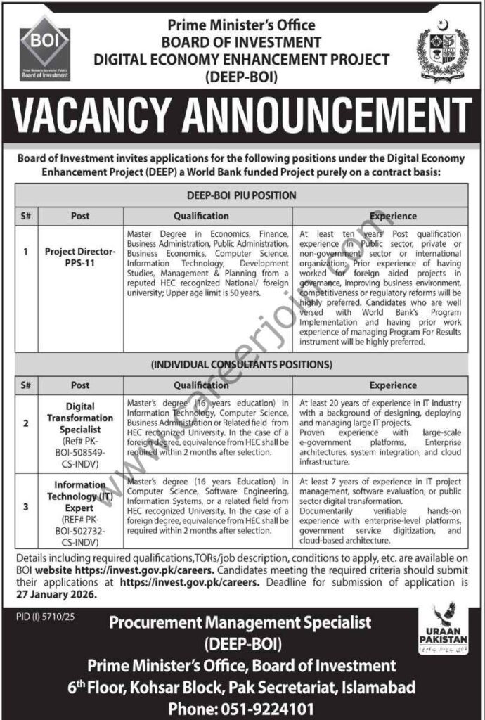 The Board of Investment in Pakistan has announced new openings for skilled professionals. These roles focus on key areas like project management and digital systems. Based in Islamabad, they offer a chance to contribute to national development projects. Applications close on January 27, 2026.