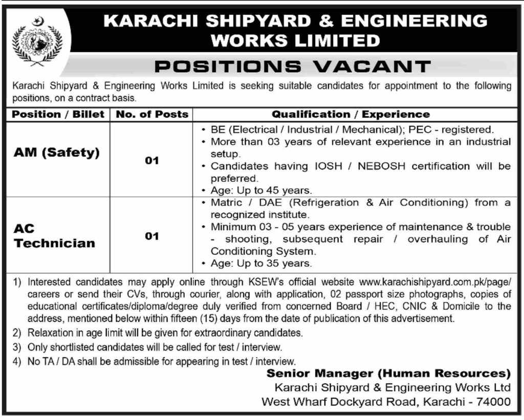 These positions support the shipyard’s ongoing work in ship construction, submarine projects, and general engineering services. KSEW plays an important role in Pakistan’s maritime and defense sectors.