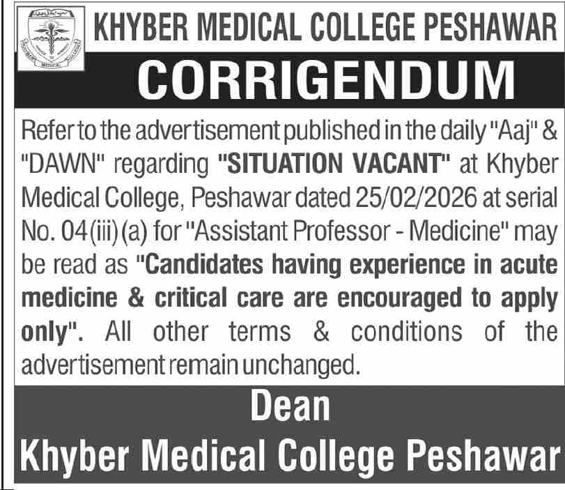 Peshawar – Khyber Medical College (KMC) in Peshawar has opened applications for several faculty and chairperson positions in various medical departments. The vacancies follow an advertisement in the Daily Dawn newspaper on February 25, 2026, under the Khyber Pakhtunkhwa Medical Teaching Institutions (MTI) framework.
