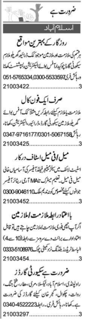 A private company in Rawat, Islamabad, has announced multiple job openings for various support and management roles. The vacancies, advertised in the daily Express newspaper around February 24, 2026, include positions such as receptionist, sales manager, cook, field officer, chowkidar, electrician, driver, office staff, office boy, house worker, and security guard.
