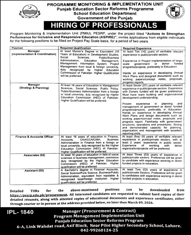 The School Education Department in Lahore, Punjab, has announced several management-level job openings. These positions are open to candidates with bachelor’s or master’s degrees. Applications must be submitted by March 9, 2026, or as stated in the newspaper advertisement.